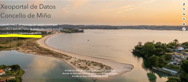 El Ayuntamiento de Miño continúa avanzando en su apuesta por acercar la administración al vecindario facilitando el acceso a los datos geoespaciales y geográficos con la incorporación del PGOM al Xeoportal de Datos, alojado en esta página.Esto permite consultar de forma sencilla y gratuita la situación urbanística de las parcelas catastrales del Ayuntamiento, añadiéndose al Inventario de Caminos y a las Fajas de Protección contra Incendios.