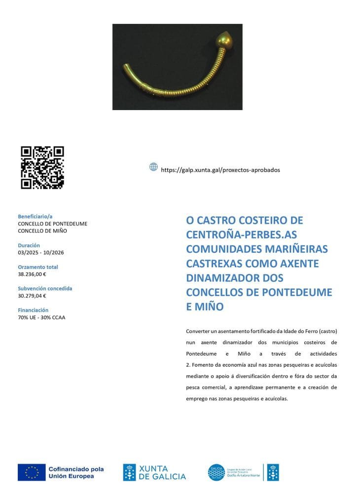 Los ayuntamientos de Miño y Pontedeume reciben una ayuda del Golfo Ártabro Norte dentro del marco del Fondo Europeo Marítimo de Pesca y Acuicultura 2021-2027 para la dinamización económica y social del territorio costero para poner en valor el castro de Centroña-Perbes.