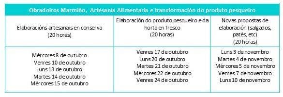Os primeiros obradoiros, de transformación do produto pesqueiro, desenvolveranse no mes de outubro e novembro na Casa do Pescador de Miño (rúa Curro, 33) en horario de tarde, de 16 a 20 h.